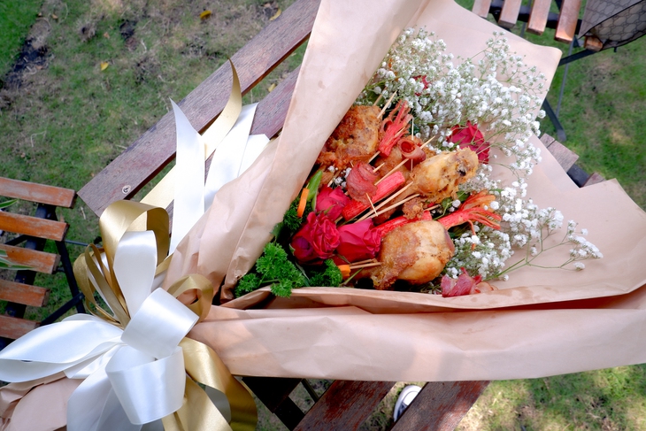Dù chỉ là những chiếc đùi gà, thịt xông khói, thanh cua… , song món Bó hoa chiên xù được thực hiện kỳ công và đầu tư hơn khi trang trí bắt mắt, lạ lẫm như một bó hoa thực thụ vừa ăn được, lại dành tặng cho bất kỳ phụ nữ nào trong dịp 8-3 ý nghĩa này.