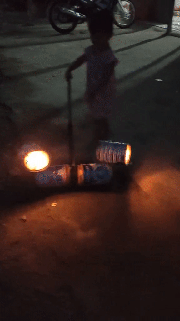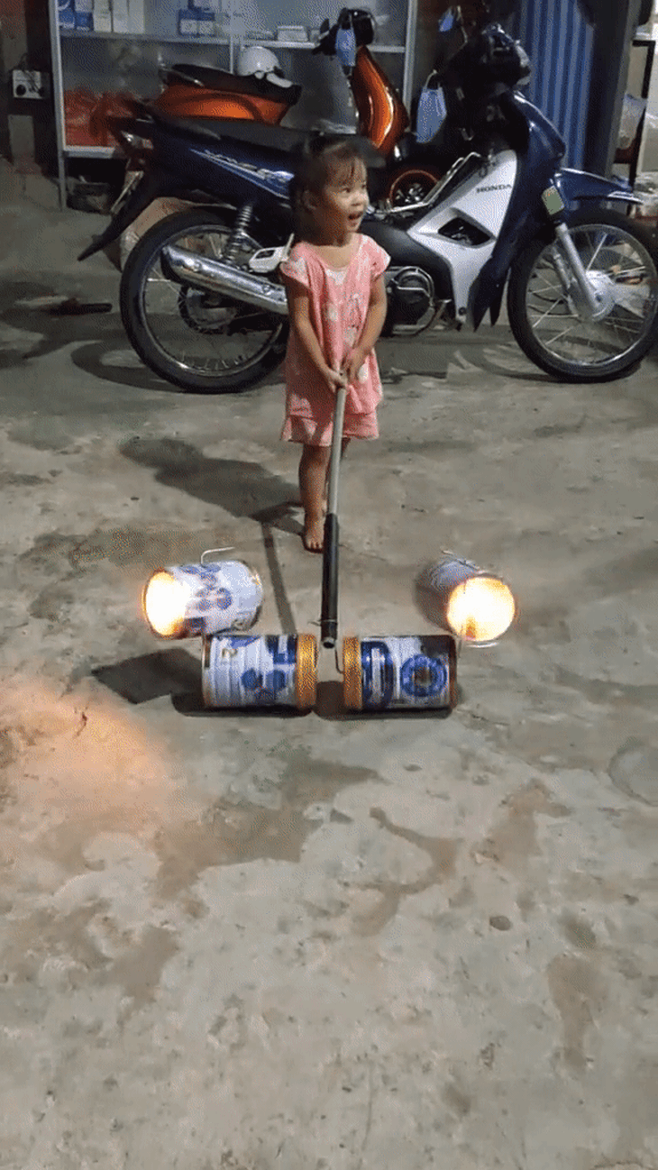 Chưa dừng ở đó, một cô bé đang đẩy chiếc lồng đèn tự chế khác được làm từ vỏ hộp sữa cũ cũng khiến dân mạng trầm trồ không ngớt. Chiếc lồng đèn xe lon này vốn là một phiên bản của đám trẻ con những năm 80, 90 khi đất nước còn gặp nhiều khó khăn, thiếu thốn.