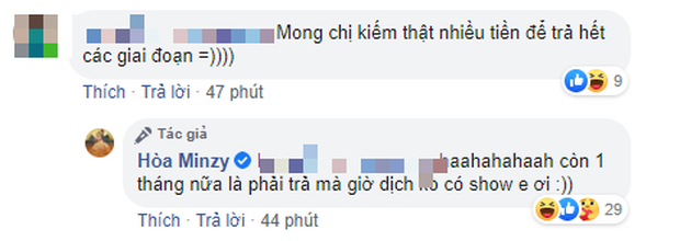 Không e ngại hay che giấu, Hoà Minzy trả lời ngay: "Còn 1 tháng nữa phải trả mà giờ dịch không có show em ơi".