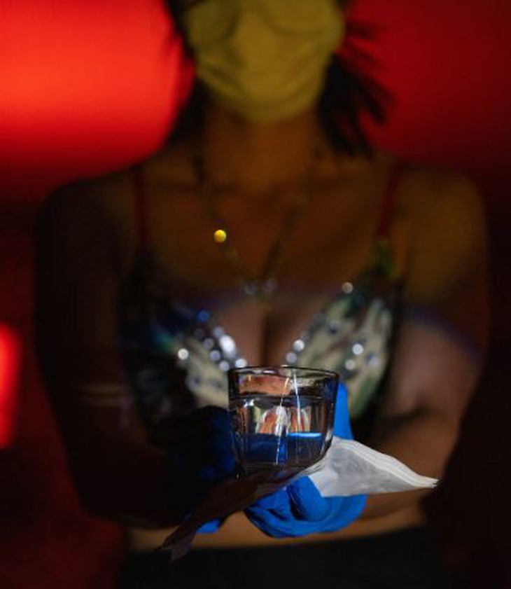 Một vũ công thấy vui vì không phải đeo khẩu trang. Và cô làm bừng lên bầu không khí, khi vừa trò chuyện vừa vẫy chào các khách quen đã…. 6 tuần không gặp.