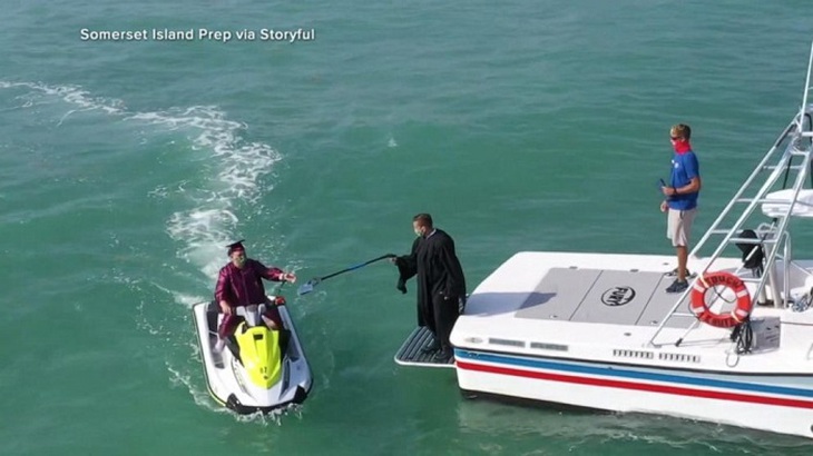 Somerset Island Prep, một trường bán công ở thành phố Key West, đã rất sáng tạo khi tổ chức lễ tốt nghiệp cho học sinh cuối cấp. Thay vì tổ chức trên đất liền, trường này đã chuyển sang làm lễ... trên biển, để đảm bảo học sinh của mình sẽ giữ khoảng cách an toàn trong đại dịch.