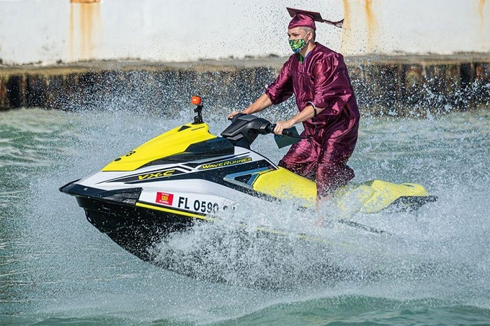 Những học sinh này đã được huấn luyện kỹ thuật chạy môtô nước trước buổi lễ. Một video cho thấy họ lướt trên mặt nước, tới trước mặt hiệu trưởng Rompella khi nhận bằng tốt nghiệp, trong khi vẫn đeo khẩu trang.