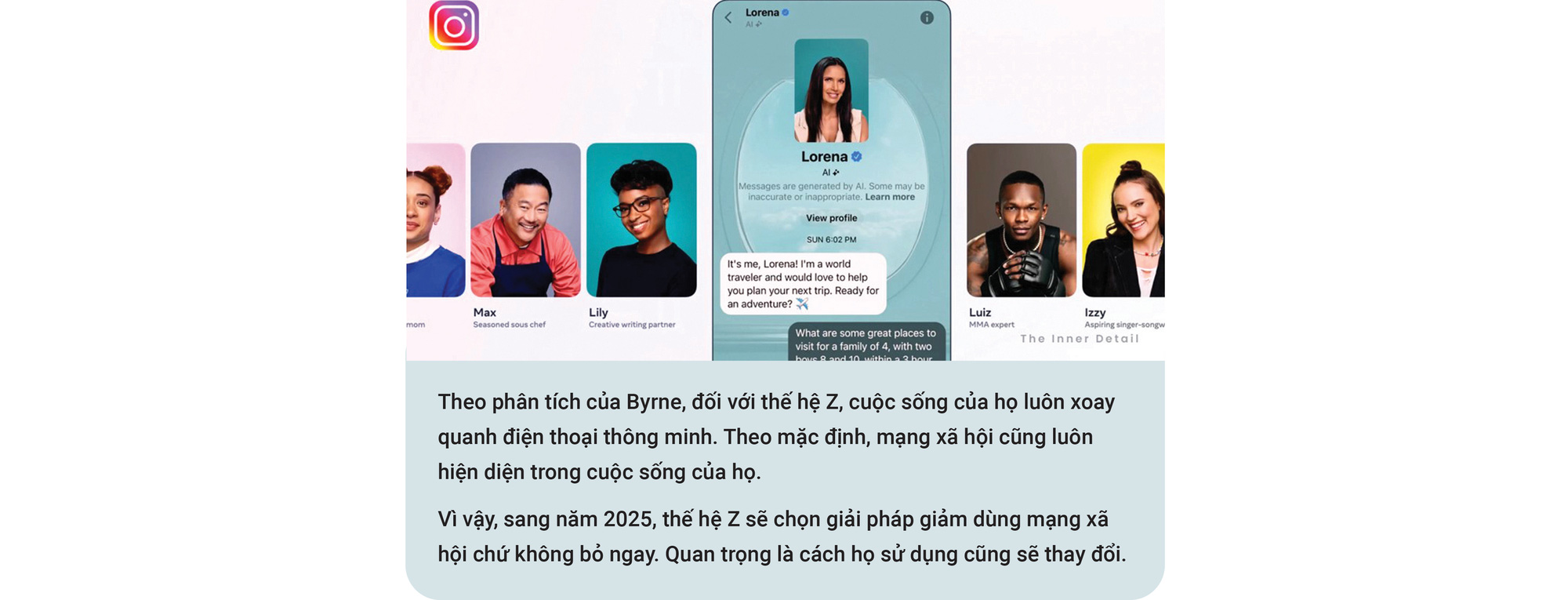 Những "người dùng AI" của Meta cũng sẽ có ảnh đại diện, giới thiệu bản thân, đăng và chia sẻ nội dung do AI tạo trên hai mạng xã hội có tổng cộng 5 tỉ người dùng khắp thế giới. Một tương lai con người giao lưu tương tác với các thuật toán trong lốt con người đã hiển hiện.