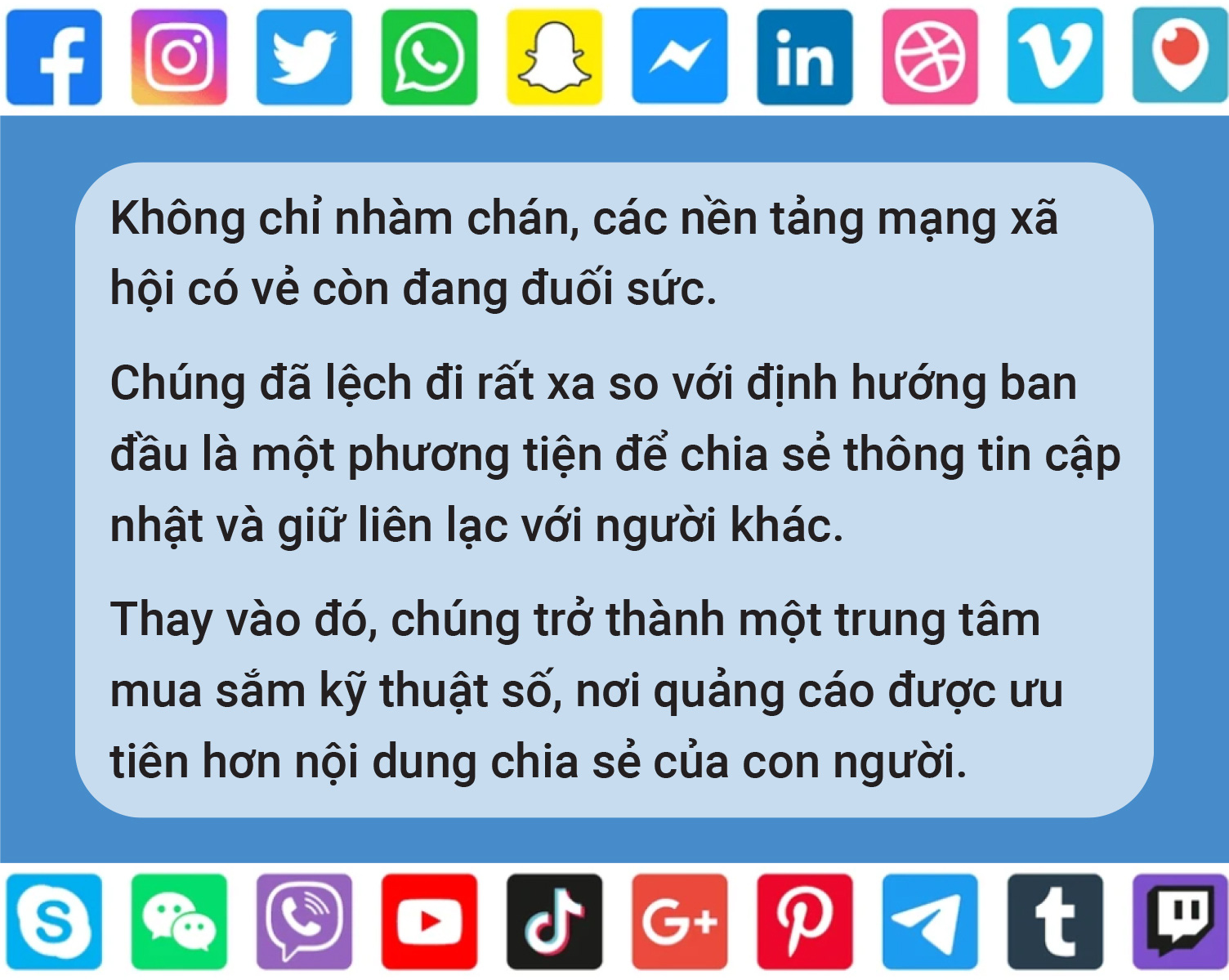 Tất cả hiện vẫn chỉ là dự đoán. Ai cũng có hàng triệu lý do khác nhau để tiếp tục đắm mình trong mạng xã hội. Dẫu vậy, những thay đổi trên hoàn toàn có thể xảy ra vào năm 2025 và duy trì ít nhất cho đến khi phát minh lớn lao tiếp theo xuất hiện.