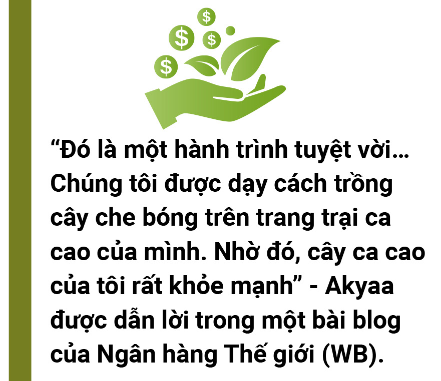 Tuy nhiên, ngày nay Akyaa ở trong số 140.000 nông dân tại Ghana áp dụng các biện pháp đổi mới, hồi sinh đất đai và gia tăng kho ca cao của họ. Họ không chỉ sản xuất nhiều ca cao hơn mà còn giảm lượng khí thải nhà kính, từ đó kiếm thêm tiền từ tín chỉ carbon.
