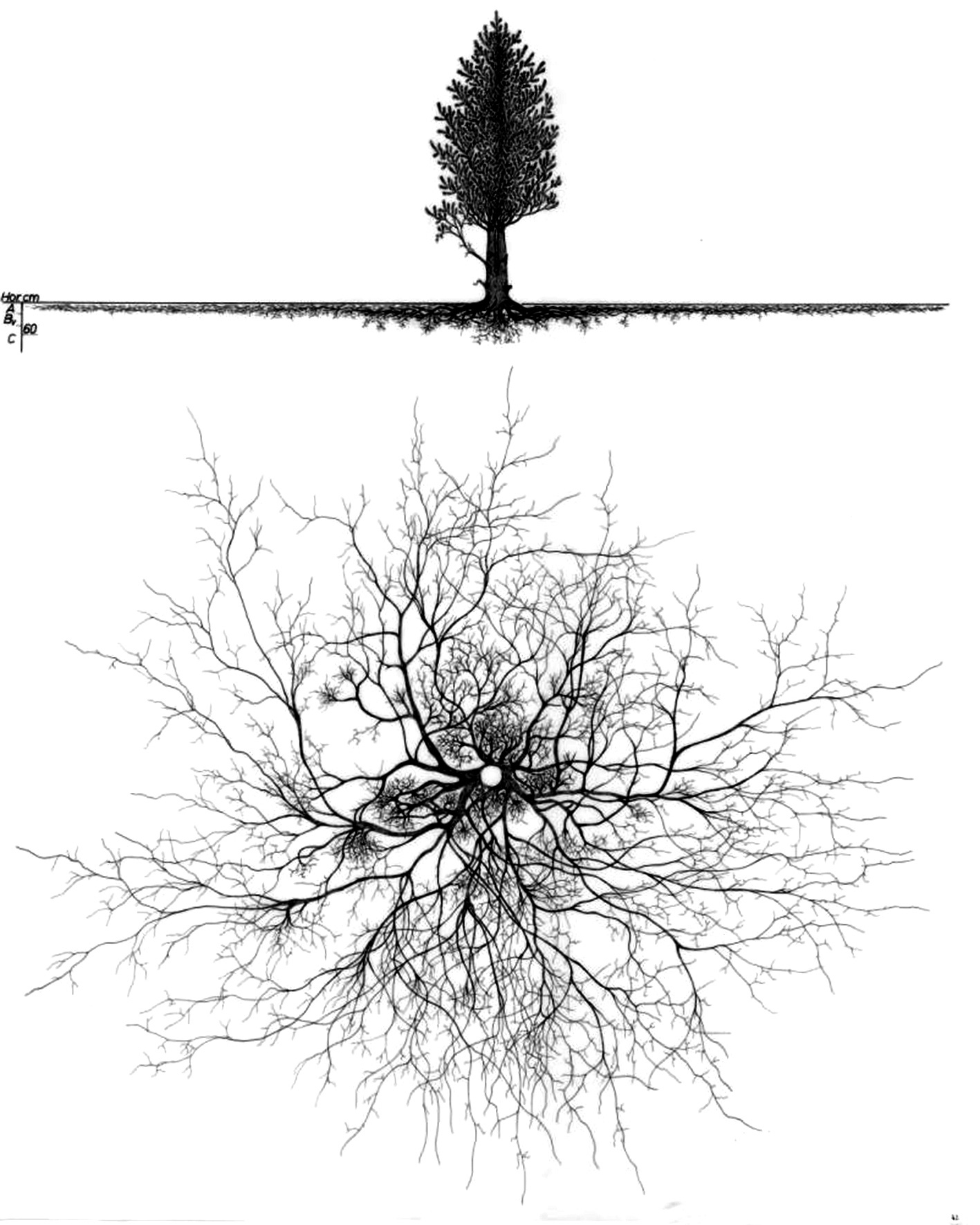Các bản vẽ cho thấy sức phát triển mãnh liệt của rễ cây. Chẳng hạn Carlina acaulis, một loài thực vật có hoa trong họ cúc, chúng nhỏ bé và nằm sát mặt đất, nhưng bộ rễ có thể ăn sâu nhiều mét trong lòng đất.