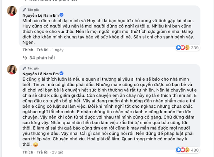 Người đẹp gốc miền Tây còn đăng tải những tin nhắn được cho là do tài khoản của anti-fan này gửi hòng doạ nạt cô lên Facebook. Đồng thời người đẹp cũng không quên đính chính mối quan hệ với Huy Hoàng, Xuân Nghị rồi khéo léo chuyển hướng sang khuyên mọi người chống dịch, giữ gìn sức khỏe.