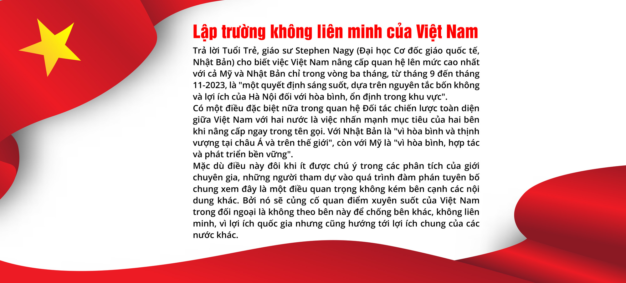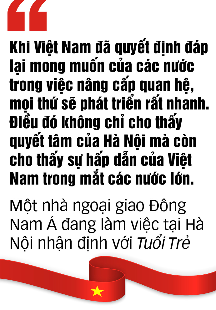 Ngoài nghệ thuật cân bằng và thúc đẩy quan hệ với hai siêu cường Mỹ - Trung, Việt Nam cũng thu hút sự chú ý thế giới khi nâng cấp quan hệ lên Đối tác chiến lược toàn diện với ba cường quốc khác trong khu vực châu Á - Thái Bình Dương: Hàn Quốc, Nhật Bản và Úc.