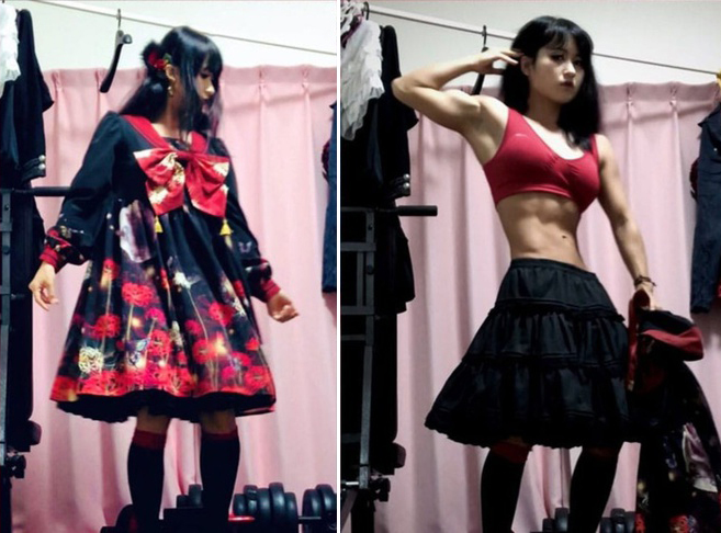 Màn khoe cơ bắp của "nàng Lolita" Nhật Bản Raraka.Sau lớp váy bồng bềnh của phong cách Lolita quen thuộc, cơ bắp của người đẹp Nhật Bản này dễ dàng khiến cánh đàn ông giật nảy mình. Cô cũng cho biết, nhờ luyện tập thể hình, cô mới có thể diện những trang phục cosplay nhiều nhân vật bởi sức nặng từ những lớp váy áo. Thông thường, một bộ trang phục không phải chỉ bao gồm váy áo mà còn hàng loạt các item khác như tất chân, chân váy, quần trong, váy phồng... cùng nhiều loại phụ kiện đi kèm.
