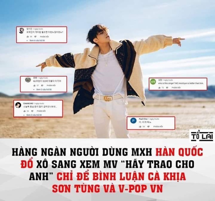 Sơn Tùng bị các netizen Hàn cà khịa ngay dưới MV Hãy trao cho anh.Trưa 5-9, cuộc chiến giữa hai fan Hàn và Việt đã diễn ra khá căng thẳng. Cụ thể, bên dưới MV Hãy trao cho anh của Sơn Tùng M-TP, các netizen Hàn Quốc đã liên tục để lại rất nhiều lời "cà khịa" Sơn Tùng về âm nhạc và nội dung. Thậm chí, có những bình luận khá gay gắt, xúc phạm nặng nề Sơn Tùng M-TP, khiến khán giả Việt đọc vào phải sôi máu đỏ mặt.