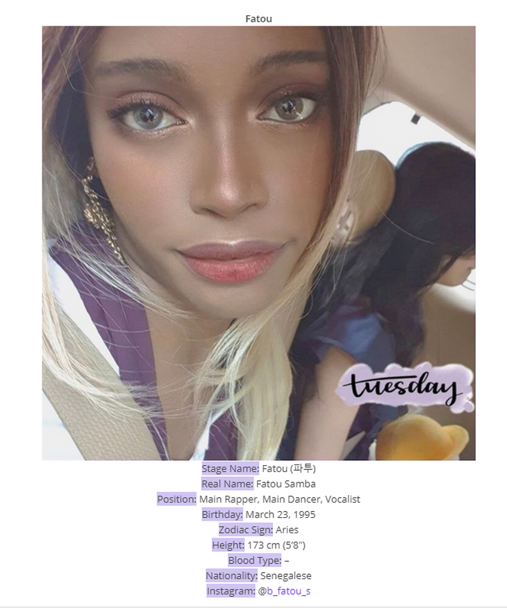 Đặc biệt, nhiều cư dân mạng đã bị hút hồn trước vẻ đẹp của Fatou, thành viên người Senegal của nhóm. Nhiều cư dân mạng đã bình luận trên một cộng đồng trực tuyến khen ngợi thành viên này vì vẻ ngoài nổi bật của cô ấy. Một số người thậm chí còn nói rằng cô ấy là người xinh đẹp nhất trong nhóm.