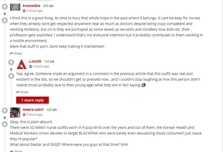 Có bình luận gay gắt hơn khi cho rằng, động thái xóa cảnh Jennie Blackpink mặc trang phục y tá đồng nghĩa với việc ủng hộ nhận định "phụ nữ là người có lỗi nếu ăn mặc sexy hoặc có phong cách gợi cảm" ngay cả khi thực tế không giống như vậy. Hay "Đã có nhiều nghệ sĩ mặc trang phục y tá trong các MV trước đây ở Kpop. Tại sao Liên minh Y tế và Nhân viên Y tế Hàn Quốc quyết định nhắm vào Blackpink, những người mặc trang phục hoàn toàn nghiêm túc? Hay chỉ vì Blackpink quá nổi tiếng nên đã bị biến thành nạn nhân? Thậm chí, sẽ có rất nhiều người chọn trang phục này trong ngày lễ Halloween mà chẳng hề bị lên án gì cả"...