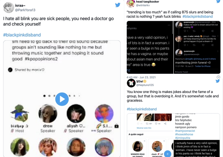 Hôm 22-6, hashtag "Blackpinkdisband" (Blackpink tan rã) được lan truyền nhanh chóng trên mạng xã hội và trở thành xu hướng tìm kiếm phổ biến trên Twitter. Điều đáng nói, những hashtag này được chính những tài khoản tự xưng là fan hâm mộ của Blackpink lan tỏa.