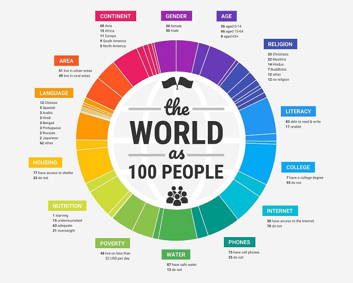 12 người nói tiếng Hoa; 6 người dùng tiếng Tây Ban Nha; 5 người nói tiếng Anh; 4 người nói tiếng Ấn; 3 người nói tiếng Ả Rập và 62 người còn lại sử dụng vào khoảng… 6.500 ngôn ngữ khác nhau.