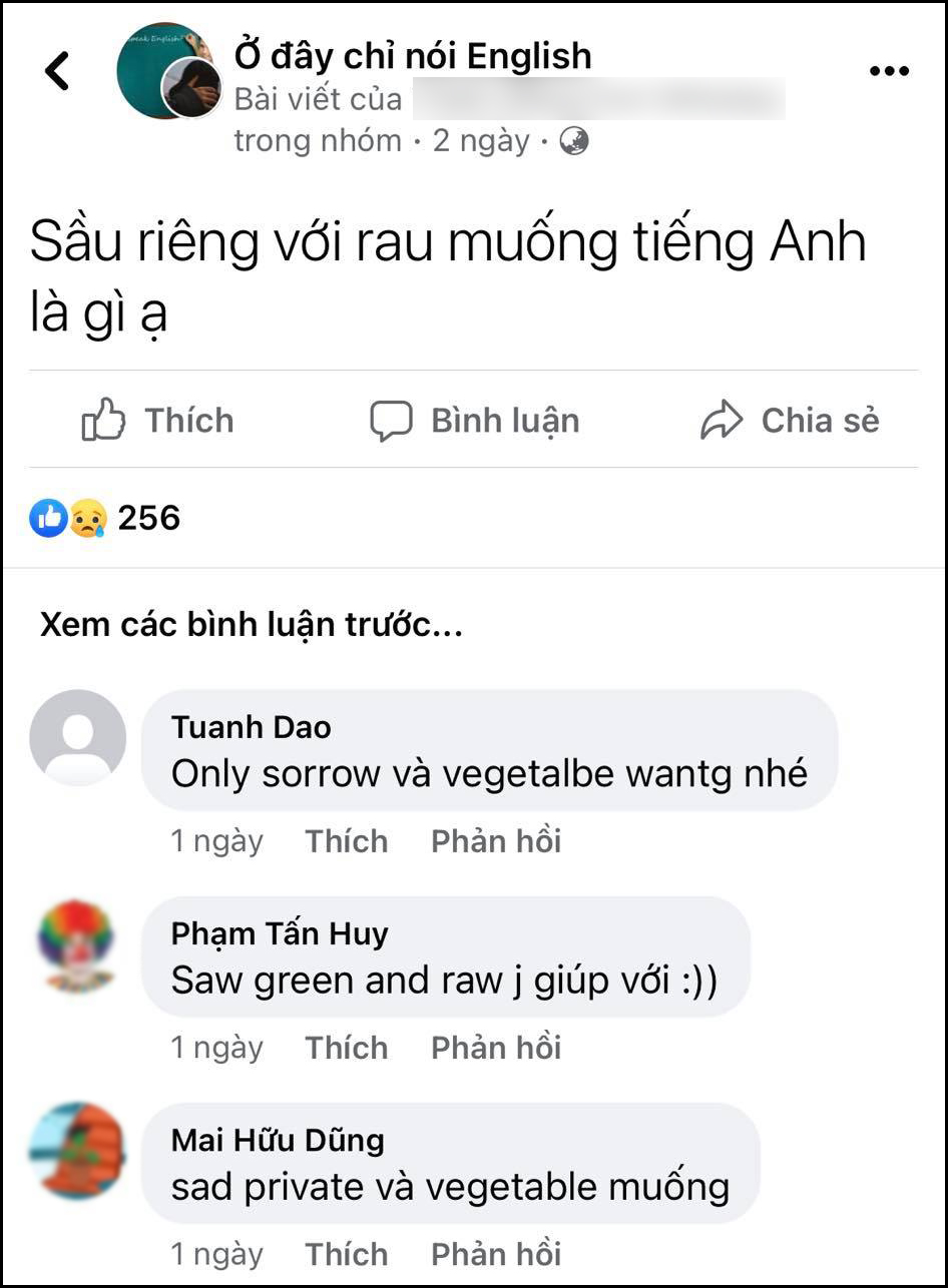 Như mới đây, một nhóm cộng đồng của những bạn trẻ yêu tiếng Anh có xuất hiện bài đăng với nội dung như sau: "Sầu riêng với rau muống dịch trong tiếng Anh thế nào?".