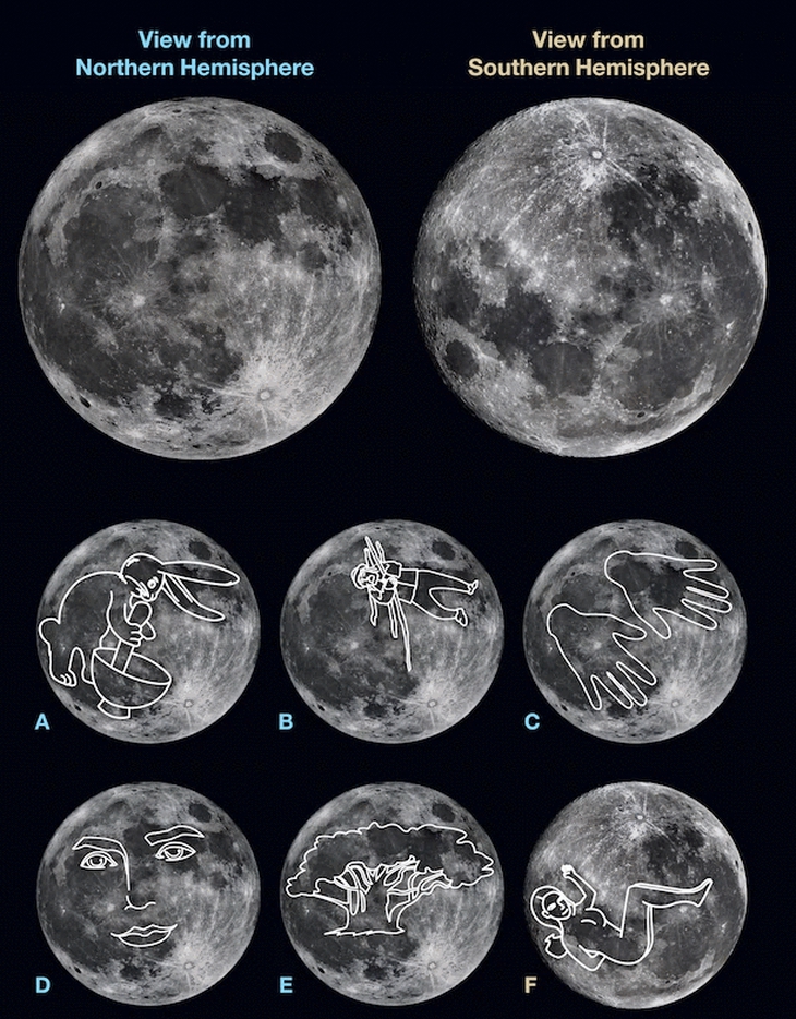 TTCT - Ngắm nhìn Mặt trăng có lẽ là chuyện con người đã làm từ thuở hồng hoang. Sau nhiều thế kỷ phát triển của nhân loại, khi khoa học không ngừng tìm hiểu, lý giải và khám phá thực thể xa xôi đó, Mặt trăng trở thành chiếc gương phản chiếu văn hóa và đức tin của con người. Qua chiếc gương ấy, người ta thấy nó “hóa thân” trong muôn hình vạn trạng. Ảnh: The ConversationTừ Trái đất, con người sẽ luôn chỉ nhìn thấy được một mặt của Mặt trăng. Thực thể đồng hành màu xám này quay trên trục của nó với cùng tốc độ mà nó quay quanh Trái đất - một sự an bài khiến cho luôn luôn chỉ có một phía của nó hướng về hành tinh của con người.Theo trang trưng bày nghệ thuật online Museum of the Moon, nhờ sự ra đời của kính thiên văn, các nhà khoa học dần phác họa nên cấu trúc bề mặt của Mặt trăng. Từ chỉ nhìn thấy một phía của Mặt trăng, năm 1959, lần đầu tiên, các nhà khoa học có thể khám phá phía luôn bị khuất của thực thể này sau khi tàu vũ trụ không người lái Luna 2 của Liên Xô đáp xuống bề mặt của nó. Nhưng phải đến những năm 1960 - 1970, các phi hành đoàn tàu Apollo mới thật sự giúp con người khai phá những bí mật của thực thể chỉ đứng sau Mặt trời về kích thước và độ sáng trên bầu trời này. Sau đó, việc thăm dò bề mặt của Mặt trăng chủ yếu được thực hiện từ xa bằng tàu đổ bộ robot, vệ tinh hoặc kính thiên văn từ Trái đất.Ngày nay, chỉ đơn giản với một cặp ống nhòm hay bằng mắt thường, ai cũng có thể nhìn thấy những phần sáng trên Mặt trăng - là những ngọn núi và miệng núi lửa được hình thành do những vụ va chạm vũ trụ; và những vùng mặt phẳng bazan rộng và tối, từng bị nhầm tưởng là biển, thật ra được hình thành từ dung nham của các vụ phun trào núi lửa cổ đại. Trông trăng hóa ngườiNhững vùng sáng, tối trên Mặt trăng được gắn cho rất nhiều cách diễn giải và mô tả khác nhau tùy vào vị trí quan sát trên Trái đất như hình sau:Mặt trăng nhìn từ Bắc bán cầu (bên trái) và Nam bán cầu. Các hình ảnh thấy được từ Mặt trăng theo các nền văn hóa: A. Thỏ dùng chày cối giã bột bánh gạo (Nhật) và thuốc trường sinh (Trung Quốc và Hàn Quốc). B. Người đàn ông vác gậy (châu Âu). C. Đôi bàn tay Astangi Mata, mẹ của vạn vật (Ấn Độ). D. Gương mặt người đàn ông (Bắc Mỹ). E. Cây đa (Hawaii). F. Rona, trinh nữ người Maori bị đày vĩnh viễn vì không tôn trọng Mặt trăng (New Zealand). -Ảnh: National Geographic Trăng có thể có muôn hình hình vạn trạng trong mắt người nhìn, nhưng mọi cách diễn giải về những hình ảnh trên cung trăng đều có chung một nguồn gốc: tâm trí của chúng ta. Theo bài “Tại sao con người nhìn thấy những khuôn mặt trên Mặt trăng?” trên tạp chí National Geographic, bộ não của con người được “lập trình” để liên tưởng những đường nét và hình dạng ngẫu nhiên với những hình ảnh mà nó vốn quen thuộc. Hiện tượng nhìn ra các khuôn mặt khác nhau trên Mặt trăng được gọi là Lunar pareidolia, hay ảo giác Mặt trăng. Đây là một nhánh của hiện tượng chung pareidolia - ảo giác khuôn mặt, khi con người thường nhìn thấy khuôn mặt trên những vật thể vô tri chứ không riêng gì bề mặt Mặt trăng.Trong một thí nghiệm để tìm hiểu cách bộ não gắn cho các loại hình dạng và đường thẳng ngẫu nhiên những liên tưởng khác nhau năm 2014, Joel Voss, nhà khoa học thần kinh nhận thức tại Đại học Northwestern, cho các tình nguyện viên xem những đường nguệch ngoạc được vẽ bằng máy tính, những hình dạng vô nghĩa tạo nên từ hình tam giác hoặc hình tròn. Các tình nguyện viên được hỏi liệu những hình dạng đó có giống cái gì đó có ý nghĩa hay không. Kết quả: họ cho biết khoảng một nửa số hình ảnh được cho xem là có ý nghĩa.Voss cũng sử dụng fMRI - quy trình chụp cộng hưởng từ chức năng giúp đo lường hoạt động của não bằng cách theo dõi những thay đổi trong lưu lượng máu - để nghiên cứu các vùng não được kích hoạt khi một người nhìn thấy những đường nguệch ngoạc. Ông nhận thấy cũng chính các vùng não đó sẽ sáng lên khi xử lý những hình ảnh thực sự có ý nghĩa.“Đối với hệ thống thị giác của con người, không có sự khác biệt nào giữa hình ảnh của một con ếch thật với một tập hợp các dấu chấm và đường nét kỳ lạ mà họ chưa từng thấy qua, nhưng lại mơ hồ giống một con ếch. Bộ não của con người cứ thế coi những vật đó là cùng một thứ” - Voss nói. Du khách chiêm ngưỡng tác phẩm sắp đặt của nghệ sĩ Luke Jerram, Bảo tàng Mặt trăng, tại tu viện Tintern, Chepstow, Xứ Wales, ngày 15-5-2018. Ảnh: Ben Birchall / PAMắt thấy nhưng não nhận dạngTrong cuốn sách The Demon-Haunted World: Science as a Candle in the Dark (Thế giới ma ám: Khoa học như ngọn nến trong đêm), nhà thiên văn học Carl Sagan đã đưa ra một lời giải thích khả dĩ cho cơ chế liên tưởng hình ảnh của não.Sagan cho rằng có lẽ việc nhận 