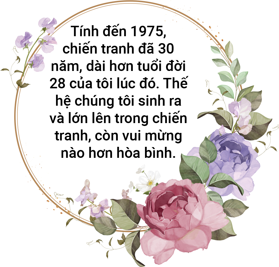 Thật khó tả cảm giác vui mừng khi nhận thấy rõ hòa bình đang đến với đất nước, nhưng đến 50 năm sau tôi vẫn còn mừng. Tính đến 1975, chiến tranh đã 30 năm, dài hơn tuổi đời 28 của tôi lúc đó. Thế hệ chúng tôi sinh ra và lớn lên trong chiến tranh, còn vui mừng nào hơn hòa bình.