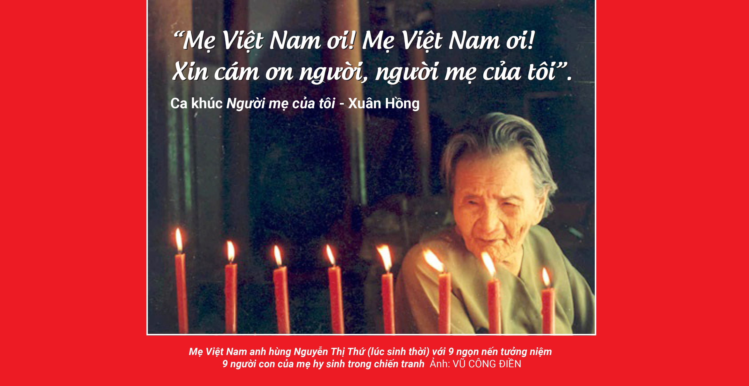Tôi từng đến các nghĩa trang liệt sĩ khắp đất nước, cứ ngẫm nghĩ đằng sau mỗi bia mộ là bao nhiêu nỗi đau. Tôi từng về thăm mẹ Thứ ở Quảng Nam khi mẹ còn sống. Về sau, mỗi lần nhìn tấm ảnh của Vũ Công Điền chụp mẹ Thứ mắt nhòa ngồi trước hàng nến chín ngọn tượng trưng cho chín người con không về, tôi nghĩ không biết có bao nhiêu người mẹ khác như mẹ Thứ ở dải đất chữ S này.