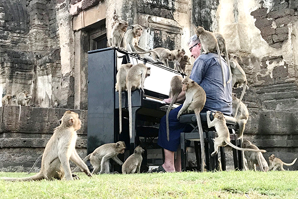 Những chú khỉ ngay lập tức được thu hút khi ông chơi những bản nhạc piano cổ điển trên một chiếc ghế đẩu đơn sơ. Ông vẫn duy trì sự tập trung vào bản nhạc khi một chú khỉ nhỏ trèo lên các phím đàn trong khi những con khỉ khác đang cố gắng giành và nhai lấy bản nhạc của người nghệ sĩ già.