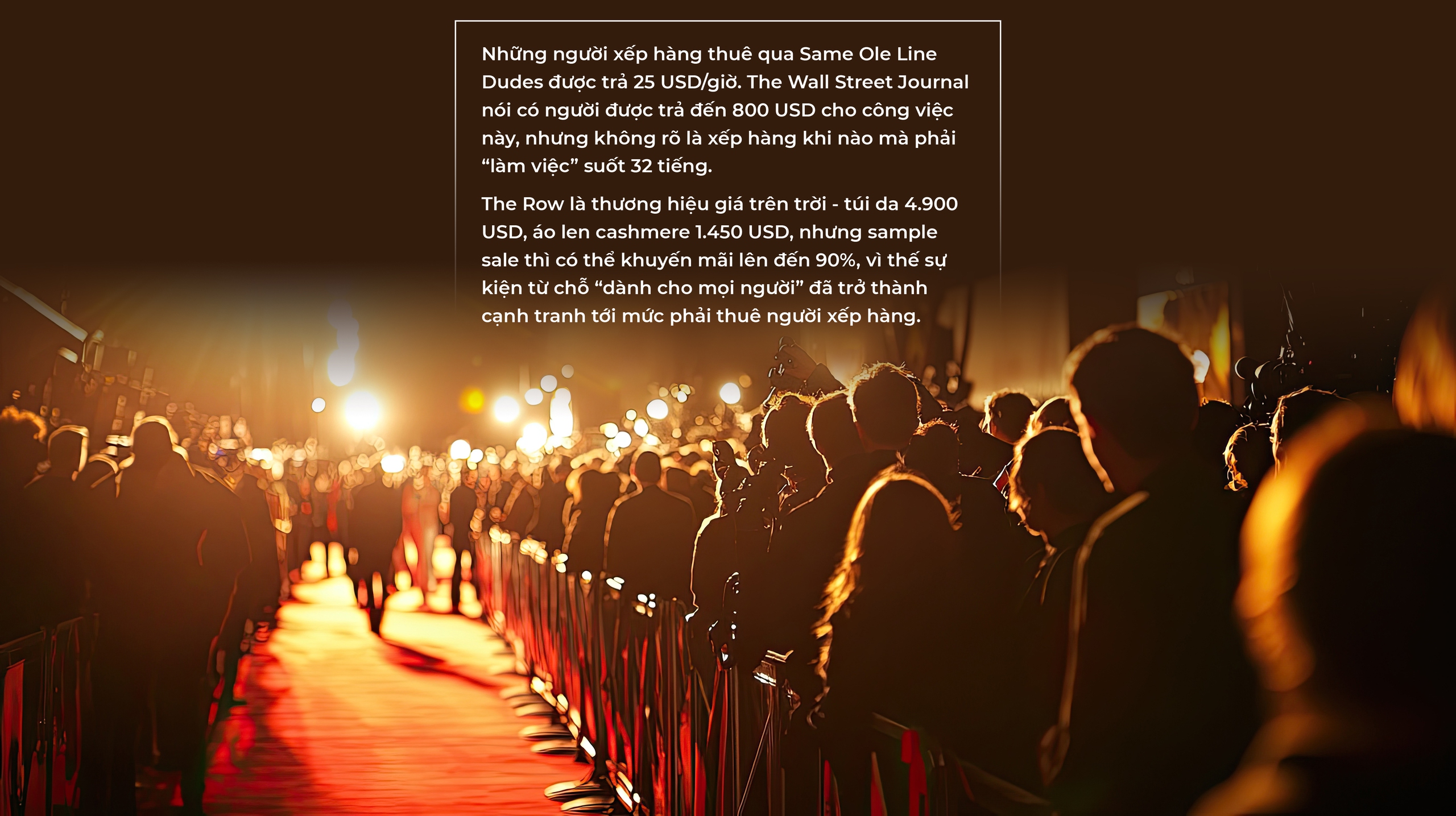 Cuối năm là dịp thương hiệu thời trang "xa xỉ thầm lặng" (quiet luxury) The Row tổ chức xả hàng mẫu (sample sale), và cũng là mùa bội thu của giới xếp hàng thuê chuyên nghiệp. Chuyên nghiệp vì có hẳn công ty đứng ra thầu, như Same Ole Line Dudes (New York).