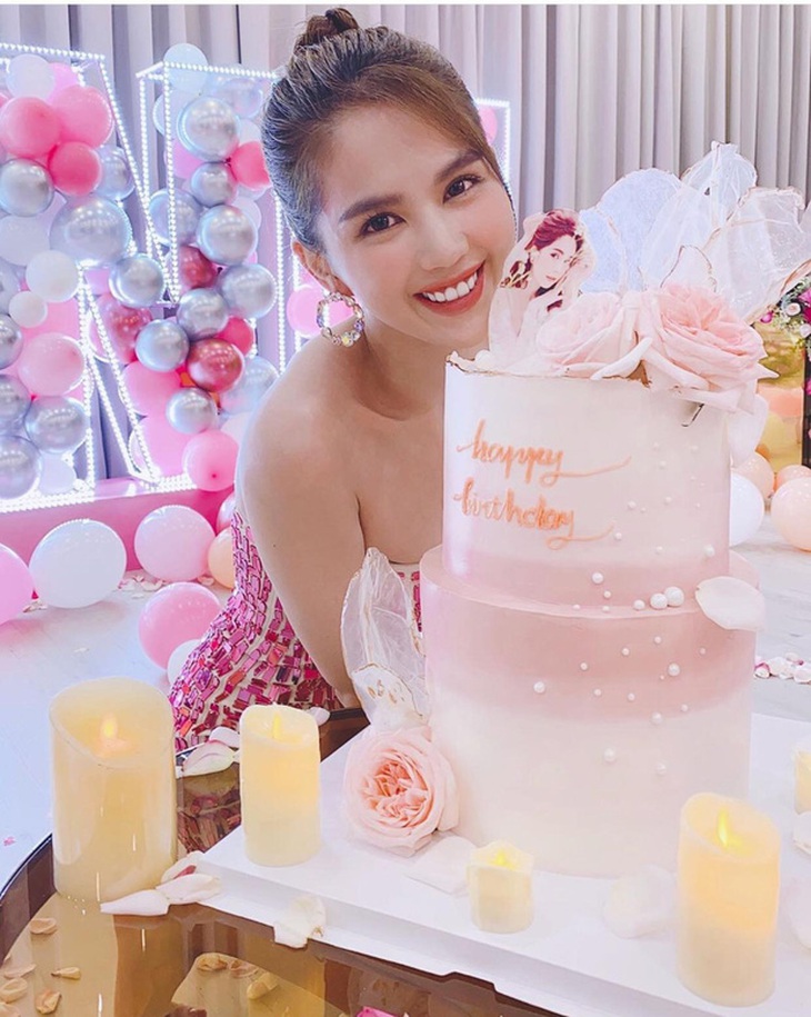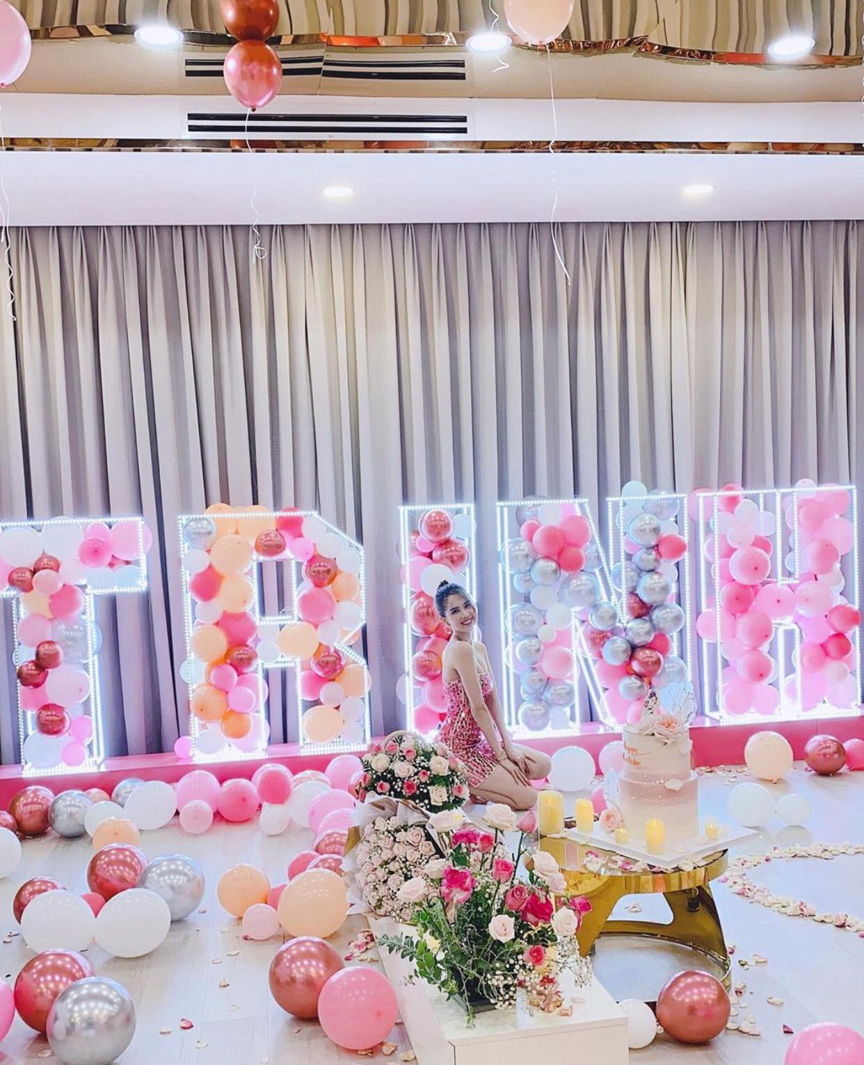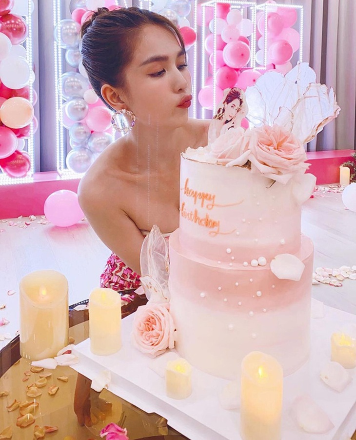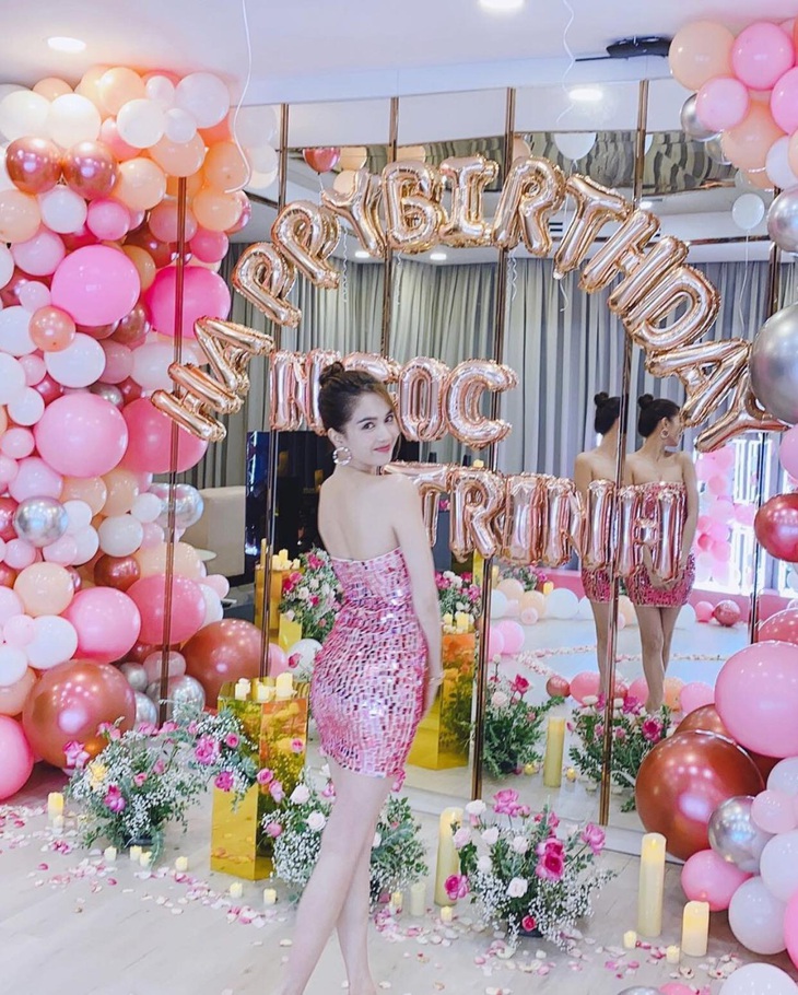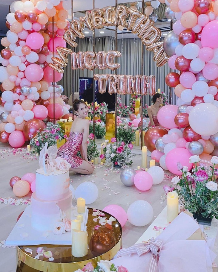 Vốn là cô nàng đam mê màu hồng, Ngọc Trinh quyết định phủ hồng biệt thự của mình với hoa tươi, bóng bay, bánh sinh nhật... vô cùng lung linh, ngọt ngào.