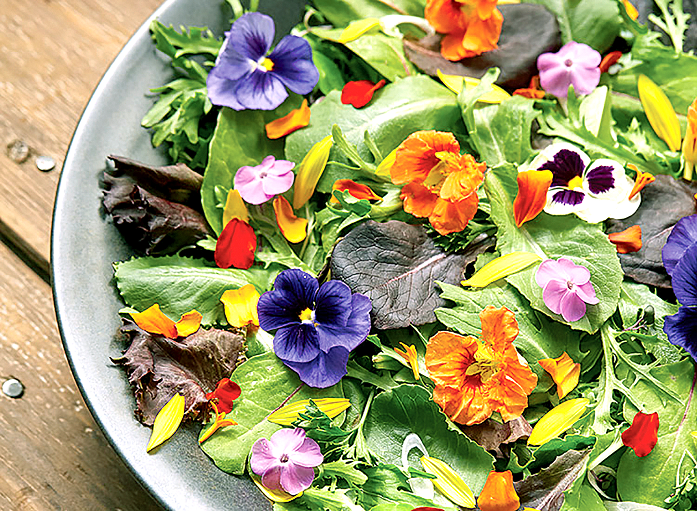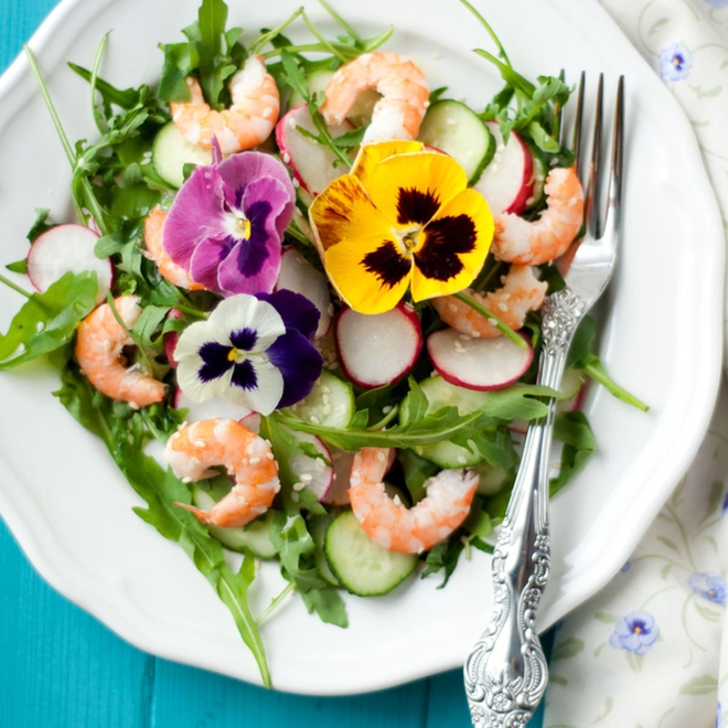 Sự kết hợp phổ biến nhất là dùng hoa trong các loại salad. Cánh hoa cúc vạn thọ, hoa thảo mộc, hoa bí cắt nhỏ, cánh hoa hồng và hoa păng xê trông đẹp mắt và có hương vị thơm ngon khi thêm vào rau xanh.