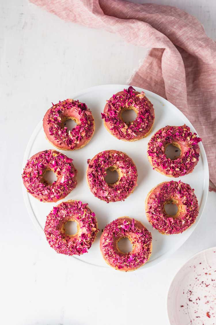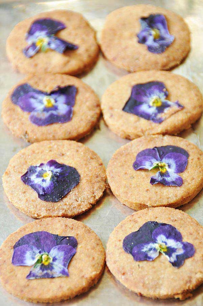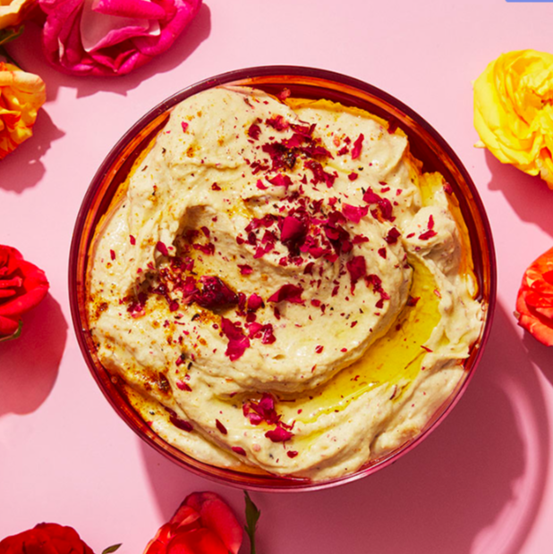 Bánh chay; bánh cookies; bánh donut hoa hồng - Ảnh: Sevenroses; Gỏi cuốn hoa dại - Ảnh: Wild Edible; Hummus (một món ăn Trung Đông và Ả Rập) hoa hồng - Ảnh: Marcus Nilsson