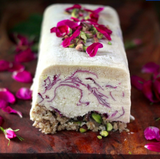 Kem hoa cơm cháy (elderflower) - Ảnh: Chew Town; Mì Ý xốt cà - Ảnh: Shiny Happy Bright; Kem semifreddo (một loại món tráng miệng) hoa hồng - Ảnh: Kitchen Vignettes; Nước hoa tử đinh hương - Ảnh: Fare Isle