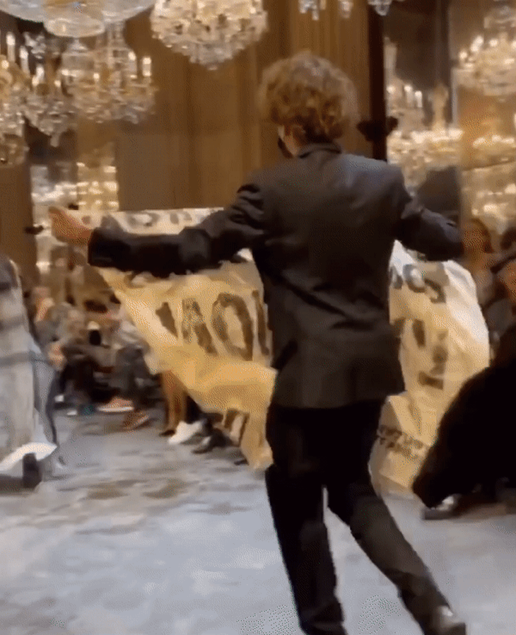 Trước hai người này, một thanh niên cũng định xông lên sàn diễn nhưng bị an ninh chặn lại ngay lối vào. Theo Reuters, những người biểu tình này đại diện cho tổ chức Amis de la Terre France - Hiệp hội bảo vệ con người và môi trường.
