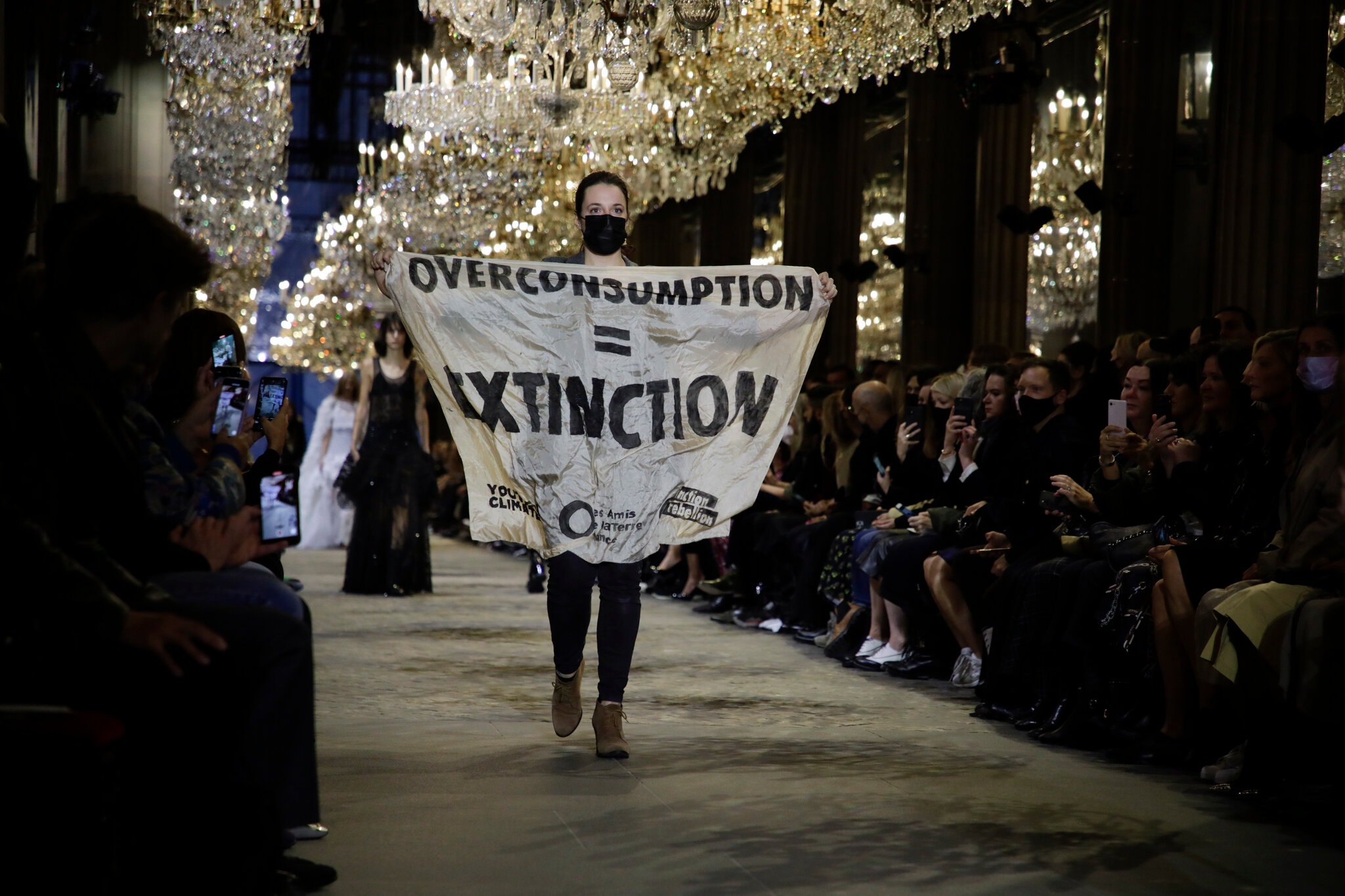 Tờ New York Times đưa tin, một nhà hoạt động khí hậu, mang biểu ngữ màu trắng với dòng chữ "Overconsumption = Extinction" (Tiêu dùng quá mức = Tuyệt chủng) in đậm, đã tham gia cùng các người mẫu trên đường catwalk cho show diễn của thương hiệu Louis Vuitton tại bảo tàng Louvre, sự kiện cuối cùng thuộc Tuần lễ Thời trang Paris vào tối 7-10.