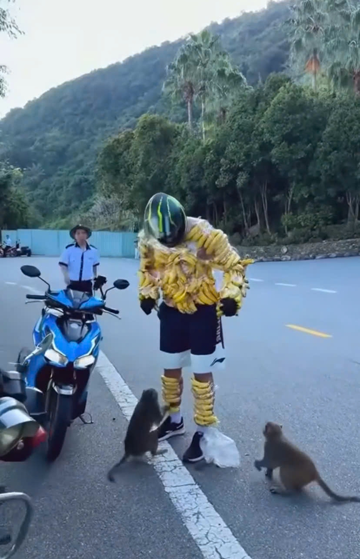 "Người chuối" cho khỉ ăn trên núi Sơn Trà - Ảnh cắt từ clip