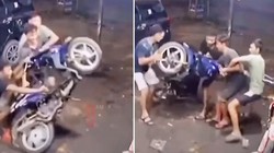 Sau một hồi đánh vật với chiếc xe máy, người đàn ông được nam thanh niên chạy đến giúp mới kiểm soát được tay ga.
