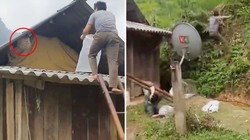 Người đàn ông đội mũ bảo hiểm bắt ong bị đốt sưng mặt