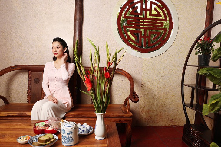 Với chiếc áo được thiết kế cách điệu từ áo tứ thân truyền thống, giúp Lâm Thu Hồng khoe trọn nét duyên dáng, cổ điển bên cành đào, bên ấm trà đậm đà vị Tết Bắc.