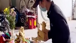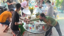 'Chị cầm cái dĩa đi, em xin con gà cúng nhé', người phụ nữ áo hồng said.