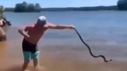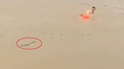 Người phụ nữ phản xạ cực nhanh khi con rắn bò trước cổng lao về phía mình.