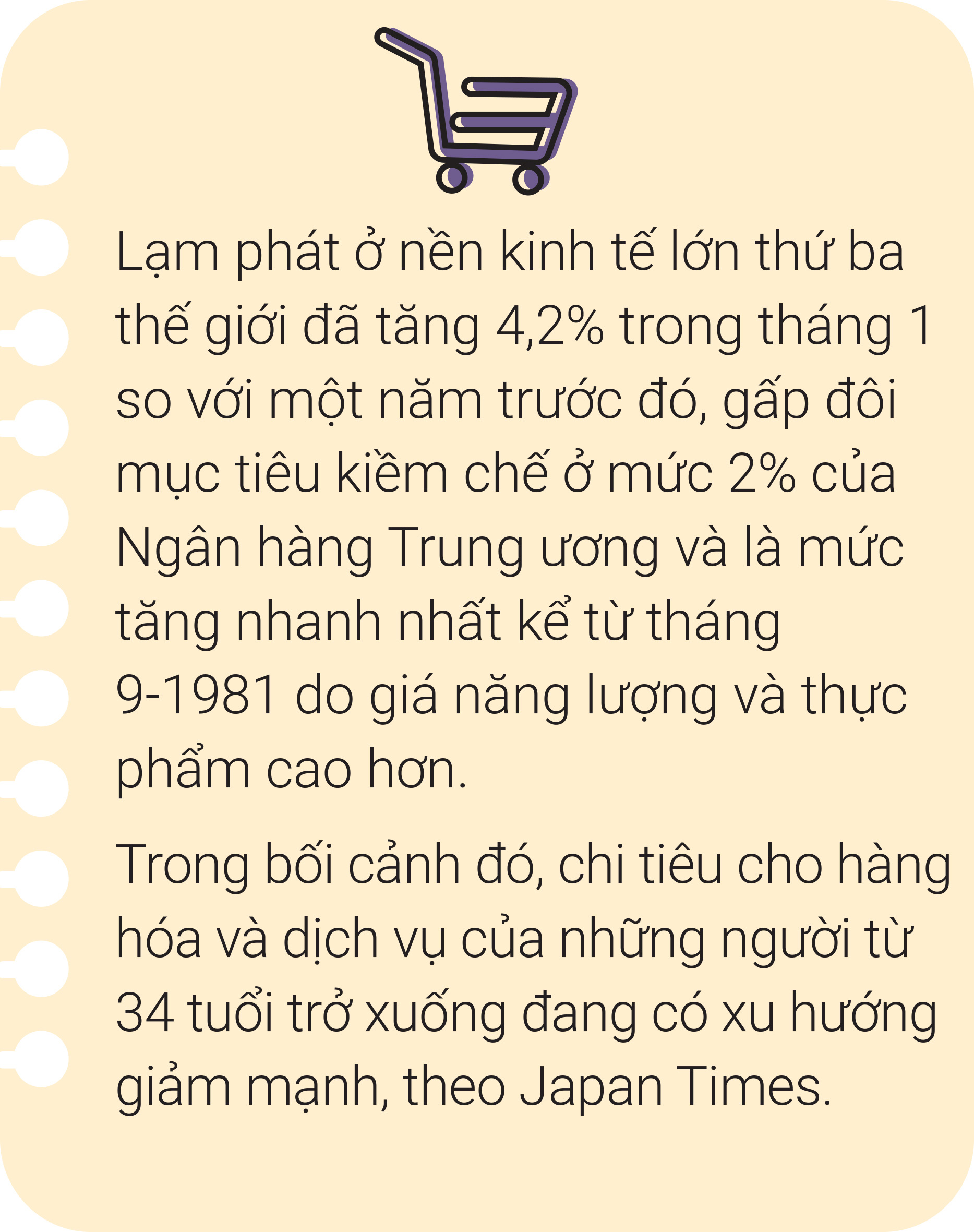 Tại Nhật, giá cả tăng cao đang làm tổn thương người tiêu dùng, đặc biệt là người trẻ. Tổng số tiền tiết kiệm tích lũy trong những năm COVID lên đến 64 ngàn tỉ yen (498 tỉ USD) cũng không giúp gì mấy cho kích thích tiêu dùng, theo báo cáo đầu tháng 2 của Văn phòng Nội các Nhật Bản.