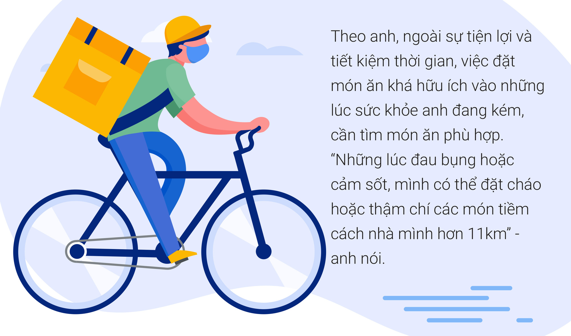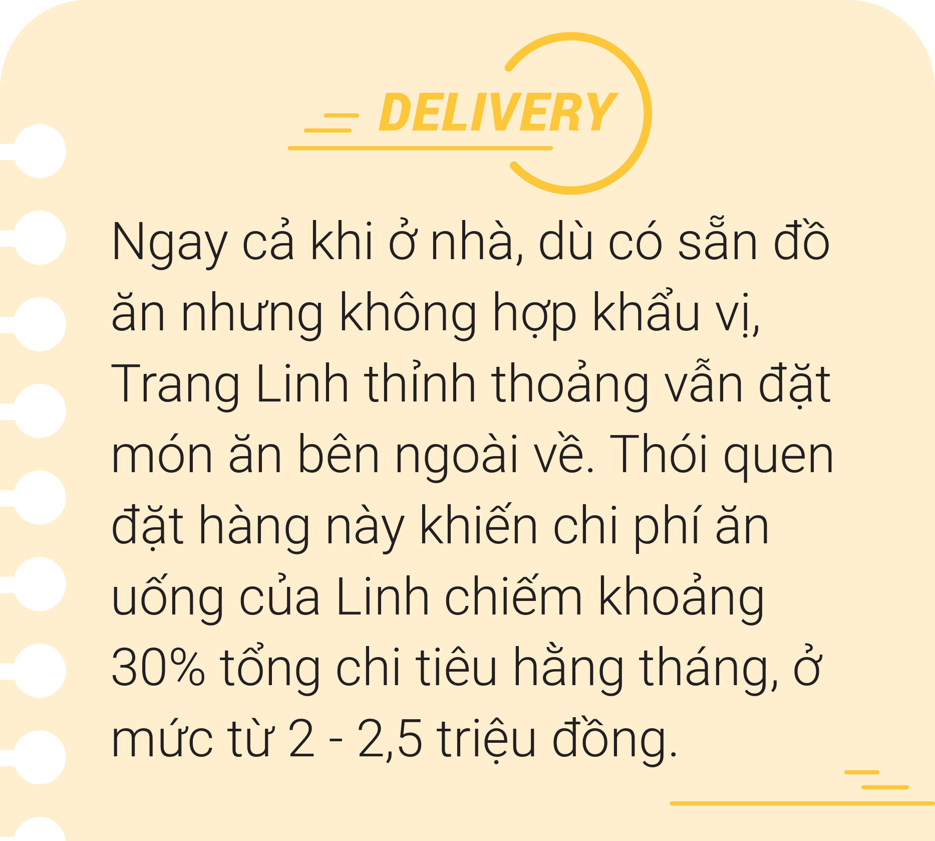 Linh giải thích dịch vụ giao nhận đồ ăn giúp cô không phải di chuyển, lại có thể thử nhiều món khác nhau với mức giá hợp lý nhờ mã khuyến mãi, chương trình giảm giá, hoặc đặt cùng bạn bè nên chi phí ship hầu như không đáng kể.