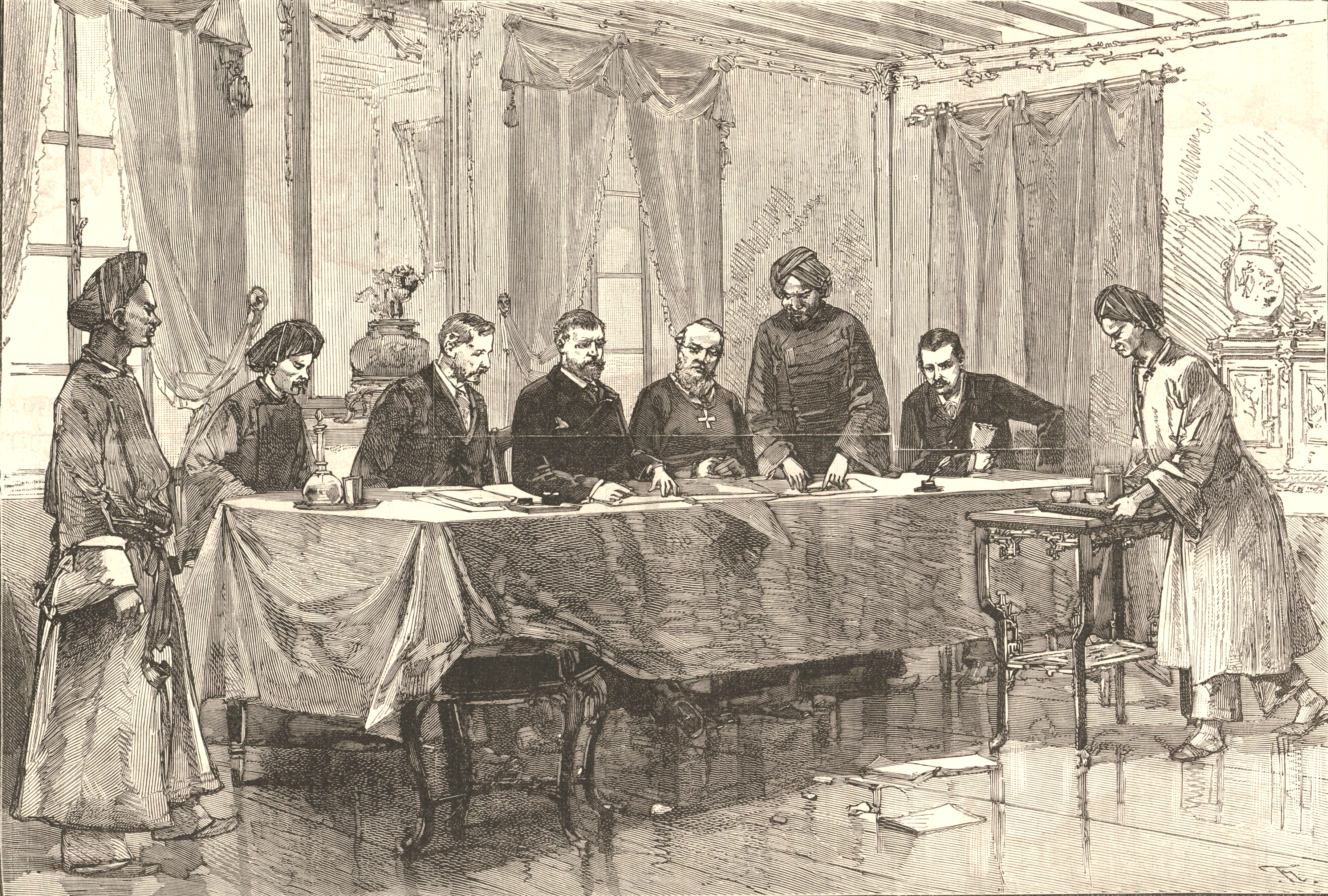 Lễ ký hiệp ước 25.8.1883 (nhằm ngày 23 tháng Bảy năm Quý Mùi, còn gọi là hiệp ước Quý Mùi hoặc hiệp ước Harmand) tại sứ quán Pháp ở Huế. Một năm sau nổ ra cuộc chiến Trung Hoa - Pháp tranh giành ảnh hưởng tại Bắc kỳ của Đại Nam Hàng ngồi từ trái qua: Hiệp biện Đại học sĩ Trần Đình Túc, Công sứ Pháp tại Huế de Champeaux, Tổng ủy viên Cộng hòa Pháp François Jules Harmand, Giám mục Huế Marie-Antoine Caspar (Lộc), Thượng thư Bộ Lại Nguyễn Trọng Hiệp (đang đứng) và đặc phái viên Masse Tranh khắc của ông de Haenen, dựa theo bản phác thảo của ông F.G. Ảnh: Le Monde illustré, số 1387, ra ngày 27.10.1883, tr. 268 Nguồn: Thư viện Quốc gia Pháp