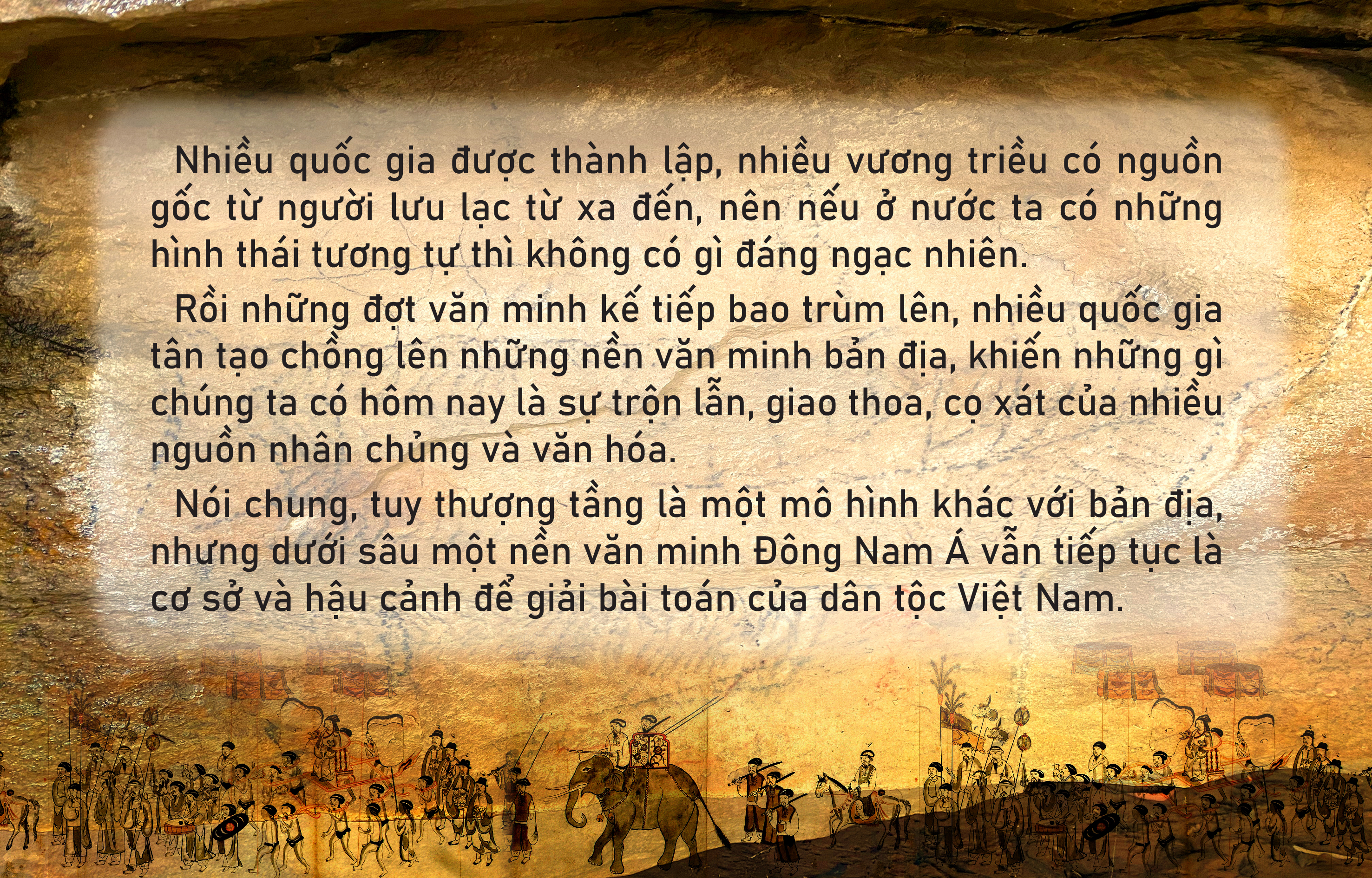 Từ trước đến nay, chúng ta học lịch sử Việt Nam theo mô hình một dân tộc/quốc gia từ lưu vực sông Hồng bành trướng xuống phương Nam, nhưng ít nhìn vào toàn cảnh khu vực để thấy rằng theo thời gian, những dân tộc hiện diện trong khu vực đã tương sinh, tương khắc, thêm vào, bớt đi, thực tế vẫn hiện diện và trộn lẫn với nhau.