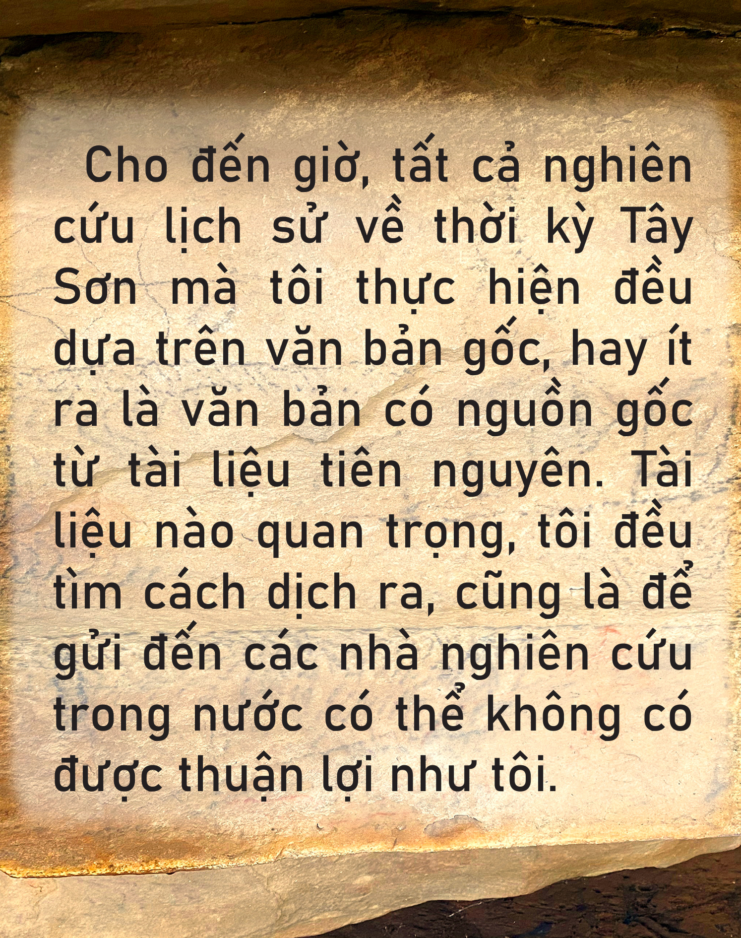 - Trước đây, khi còn ở trong nước, việc tìm hiểu lịch sử của tôi bị hạn chế, do hoàn cảnh cá nhân cũng có, mà bởi khung cảnh xã hội cũng có. Nghiên cứu sử phải dựa trên tài liệu, dĩ nhiên tài liệu đáng tin thuộc dạng tiên nguyên (primary source) chứ không phải huyền sử, dã sử.