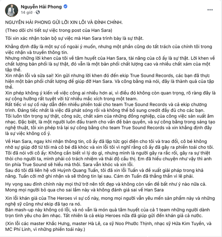 Nam nhạc sĩ cho rằng đây là một sự cố ngoài ý muốn và bắt nguồn từ tất trách của chính vị Master này trong việc nhận và truyền thông tin. Bên cạnh đó, Nguyễn Hải Phong cũng dành lời khen ngợi cho học trò Han Sara là một cô gái hiểu chuyện, nhạy bén và có trách nhiệm.
