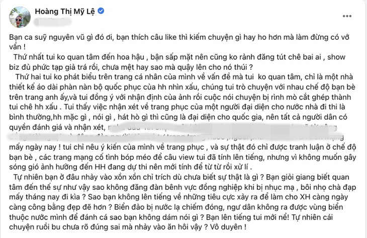 Ngoài ra, nữ ca sĩ cũng cho biết, lời bình của mình chỉ là một phần trong cuộc hội thoại với nhà thiết kế quen biết nhưng lại bị "rình mò, cắt ghép" rồi xuyên tạc thành Mỹ Lệ chê hoa hậu xấu.