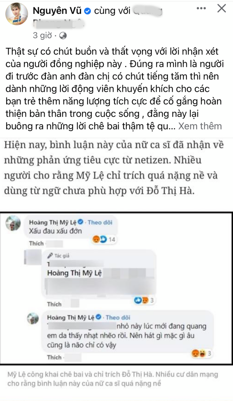Nguyên Vũ công khai dằn mặt nữ đồng nghiệp vì lời chê bai một hoa hậu.Mặc dù cuối bài đăng, Nguyên Vũ kết luận Mỹ Lệ là người có "tánh kỳ", nhưng sau đó, nam ca sĩ tiếp tục phân tích về lời chê bai của giọng ca Dòng sông không trở lại là "quá đáng" khi sử dụng cụm từ nặng nề để nói về phụ nữ. Theo nam ca sĩ, việc dùng cụm từ "xấu đau xấu đớn" là một cách xúc phạm và kỳ thị phụ nữ không nên có.