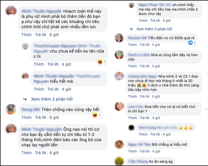 Phía dưới bài đăng của mẹ trẻ, ai nấy đều cảm thông trước sự chịu đựng, hi sinh của người phụ nữ khi bị chồng trách nhầm. Đa phần cư dân mạng cho rằng đây là mức sinh hoạt phí vô cùng hợp lý, đối với một gia đình ở thành phố có hai con nhỏ.