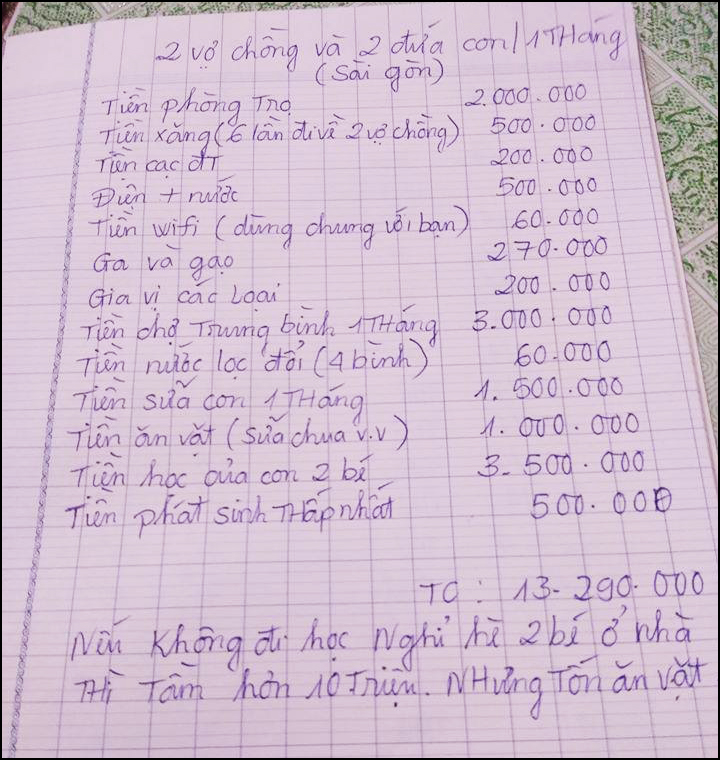 Chi tiết từng khoản chi của gia đình nhỏ gồm hai vợ chồng và hai con còn nhỏ. (Ảnh: Đ.T.)Khoản chi cao nhất trong bảng sinh hoạt phí này là phần tiền dành cho việc học của hai bé, vào khoảng 3.500.000 đồng. Kế đó là tiền chợ trung bình mỗi tháng sẽ chi khoảng 3.000.000 đồng. Đây là hai khoản chi phí cao nhất, chiếm gần 50% sinh hoạt phí mỗi tháng. Tuy nhiên ở những tháng hè, được nghỉ học thì khoản học phí sẽ được giảm xuống, tuy nhiên lại "tốn ăn vặt".