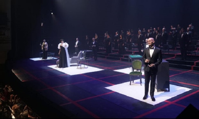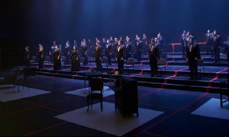 Dựa trên tiểu thuyết Trà Hoa Nữ của Alexandre Dumas con, cảnh mở màn vốn dĩ là tiệc tùng sang chảnh nay cũng nhuốm màu u ám, khi dàn hợp xướng trong trang phục trắng và đen giãn cách đúng 2 mét. Ít phút vào vở, diễn viên mới bỏ khẩu trang khỏi mặt, đúng theo những nốt do dàn nhạc tấu lên.