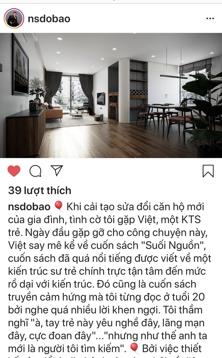 Thiết kế tối giản cùng gam màu trầm, đúng với cá tính của nhạc sĩ Đỗ Bảo.Càng thú vị hơn khi người giúp Đỗ Bảo "xây tổ ấm" lại chính là ông xã của ca sĩ Hoàng Quyên - kiến trúc sư Tuấn Việt. Nói về mối duyên này, nhạc sĩ Đỗ Bảo hào hứng chia sẻ chính nhờ Sóng hấp dẫn - dự án mới nhất của Hoàng Quyên, với các sáng tác của Đỗ Bảo - Võ Thiện Thanh, đã giúp Đỗ Bảo tìm được "người xây tổ ấm".