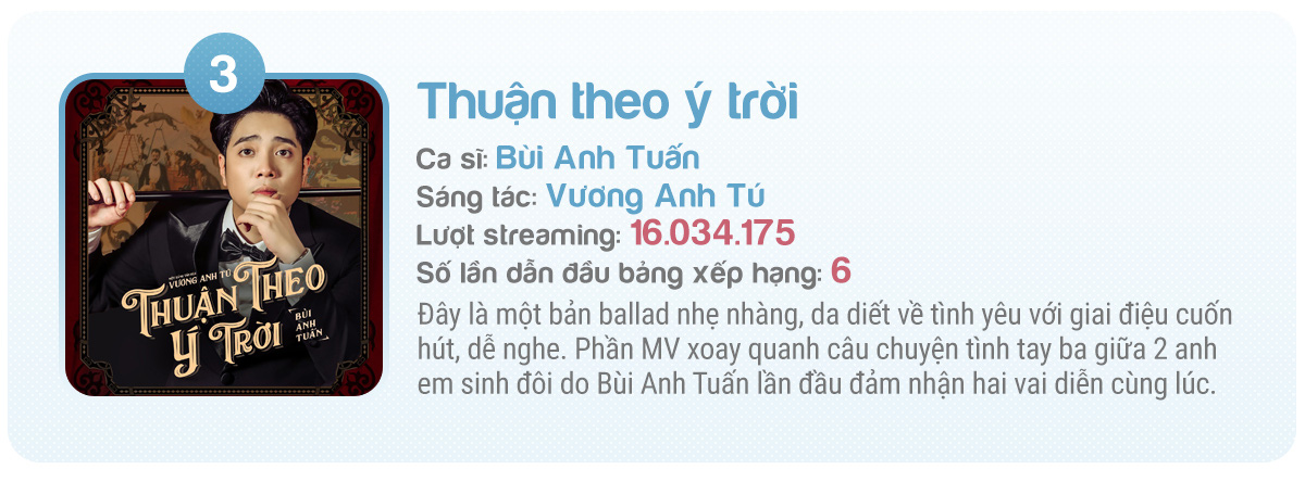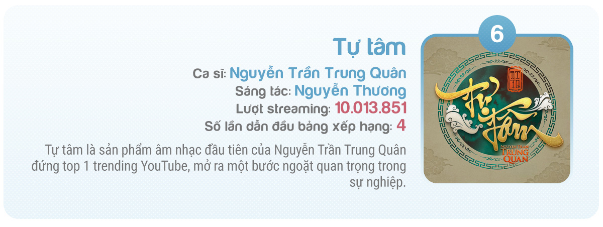 Trong những năm gần đây, cái tên Nguyễn Trần Trung Quân được đông đảo khán giả nhắc đến bởi những sản phẩm chất lượng và đạt lượt streaming cao như Canh ba, Tự tâm, Trong trí nhớ của anh hay Màu nước mắt.