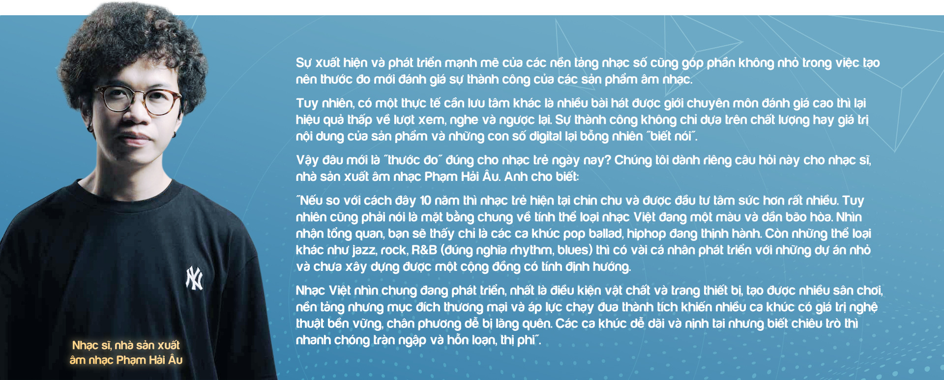 "Khi đã có nền tảng vững chắc, người nghệ sĩ có thể phát triển, bay bổng mọi sáng tạo mà không sợ làm biến dạng hoặc làm mất đi bản sắc, hồn cốt của văn hóa dân tộc. Việc phát triển dựa trên những nền tảng đã được bảo tồn đòi hỏi nhiều am hiểu, từ các yếu tố như thang âm, điệu thức... cho đến phần hình ảnh và phục trang cũng thế", nhạc sĩ nói.